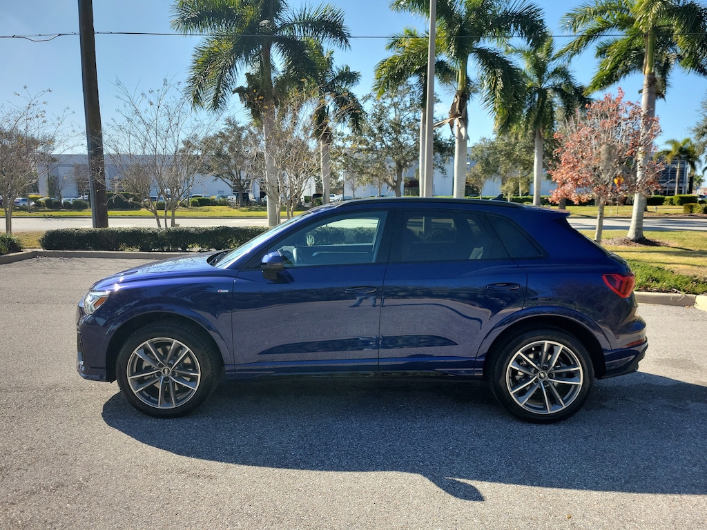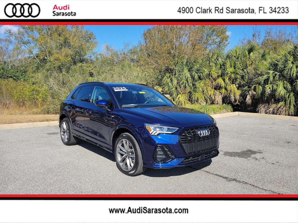 Pricing excludes tax, tag, title and pre-delivery service fee of $999 and private tag agency fee of $24.40. *See below for details..LEASE SPECIALS AVAILABLE!..Audi Sarasota Courtesy Vehicle with Only 6,447 Miles..Audi Certified!..This All Wheel Drive Q3 Premium S Line Quattro includes Convenience & Black Optic Sport Packages with Audi Side Assist Blind Spot Warning..Lane Departure Warning..Rear Cross Traffic Alert..Backup Camera..Adaptive Cruise Assist with Lane Guidance..Audi Pre Sense Front (Forward Collision Warning and Avoidance Assist)..Audi Pre Sense Basic..Audi Parking System Plus..Full LED Headlamps..High-Beam Assist..Apple CarPlay/Android Auto..Panoramic Moonroof..10.25" Digital Display..Alarm System with Motion Sensor..Audi Connect..3- Zone Climate Control..10.1" Touchscreen..Bluetooth for Phone & Audio..Wireless Phone Charging Pad..USB Ports..Power Tailgate..19" Alloy Wheels..Power Adjustable, Heated Leather Sport Seats..Satellite Radio..2.0L 228 HP 4 Cylinder Turbo..8 Speed Automatic Transmission..Audi Drive Select..Quattro AWD System..All power equipment and much more..All pre-owned cars regardless of make and model are driven and evaluated by our highly qualified service personnel. Call Our Sales Team Now at 941-922-0000 for More Info, a Test Drive Appointment or to have a Custom Video Sent to you on this Vehicle. Fast Out Of State Shipping Available..Over 125 components are inspected by Audi trained technicians to ensure each Audi Certified pre-owned vehicle is in optimal condition. Only after this comprehensive dealer inspection are we confident in backing the vehicle with our Audi Certified pre-owned Limited Warranty, which is more than a seal of approval, it's a badge of honor. When the Audi New Vehicle Limited Warranty expires, the Audi Certified pre-owned Limited Warranty becomes effective and provides coverage for a period of one year or 20,000 miles, whichever occurs first. (See dealer for details)..What the reviews say about this car...The 2025 Audi Q3 is a good choice for a subcompact luxury SUV. A smooth ride and standard all-wheel drive for sure-footedness in poor weather conditions are highlights. Good standard tech, serene cabin experience, high-quality interior materials. The Q3 has a few tricks up its ultra-modern sleeve, with a strong offering of standard features including heated leather seats, a sunroof, and adaptive cruise control. Looking like a Q5 that shrank slightly in the dryer, the Q3 maintains Audi's focus on current technology and superb handling. With the Audi Q3 40 removed from the lineup for 2025, the Q3 S Line 45 carries on with a turbo 2.0-liter four-cylinder kicking out 228 horses and 251 lb-ft. . Audi managed to package a surprisingly spacious interior into the Q3's compact footprint. Combined with the standard panoramic sunroof, leather upholstery and heated front seats, the Q3 finally feels worthy of the four-ring logo. The smallest Audi SUV is a stylistic gateway to the brand. Certain Audi hallmarks distinguish the Q3. The exterior design is understated yet tastefully detailed. Inside, impressive digital displays accompany a similarly contemporary design aesthetic. The back seats are rather roomy given the SUVs exterior dimensions. Certain Audi hallmarks distinguish the Q3. The exterior design is understated yet tastefully detailed. Inside, impressive digital displays accompany a similarly contemporary design aesthetic. The back seats are rather roomy given the SUVs exterior dimensions. The ultra-modern Q3 boasts understated elegance, and it comes with a long list of standard features, top-notch materials and ample tech. The Q3 has an upscale interior design, with quality materials and standard luxury items like leather upholstery, a panoramic sunroof and heated front seats. The interior benefits from a clean and clutter-free design, with modern tech and intuitive controls.