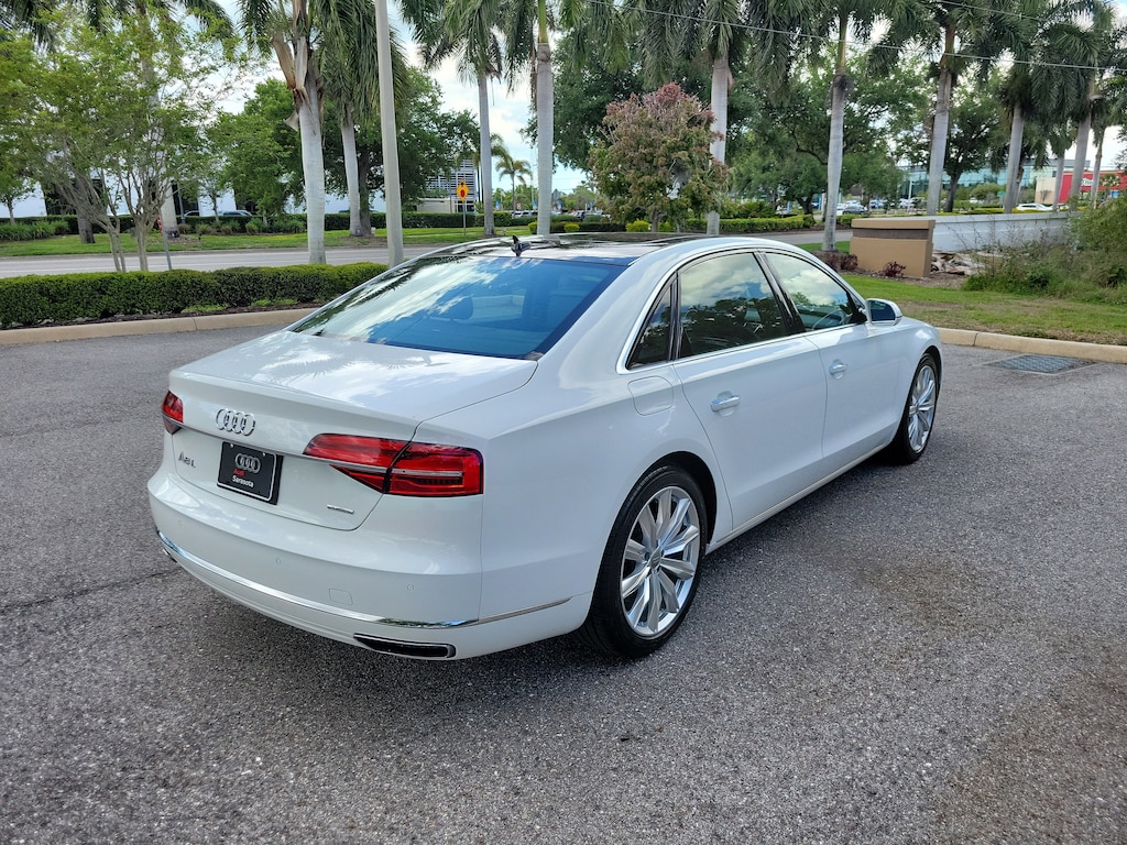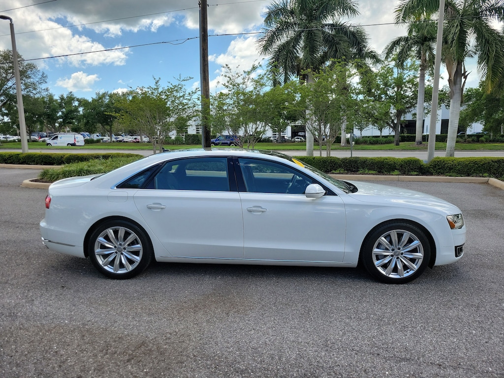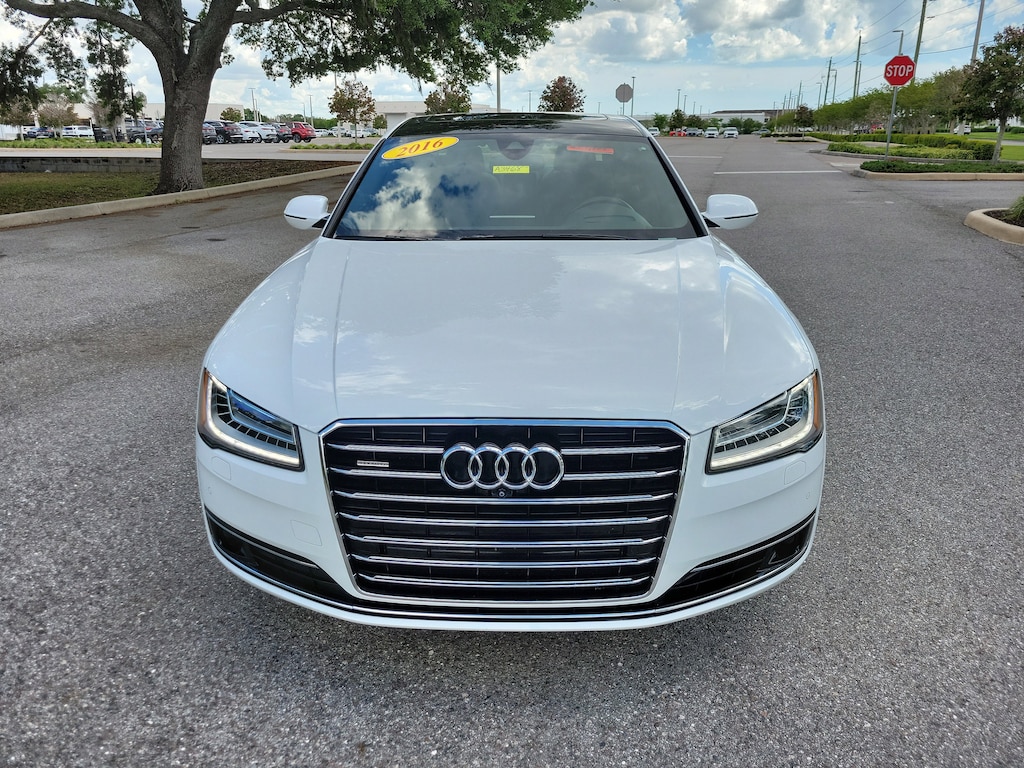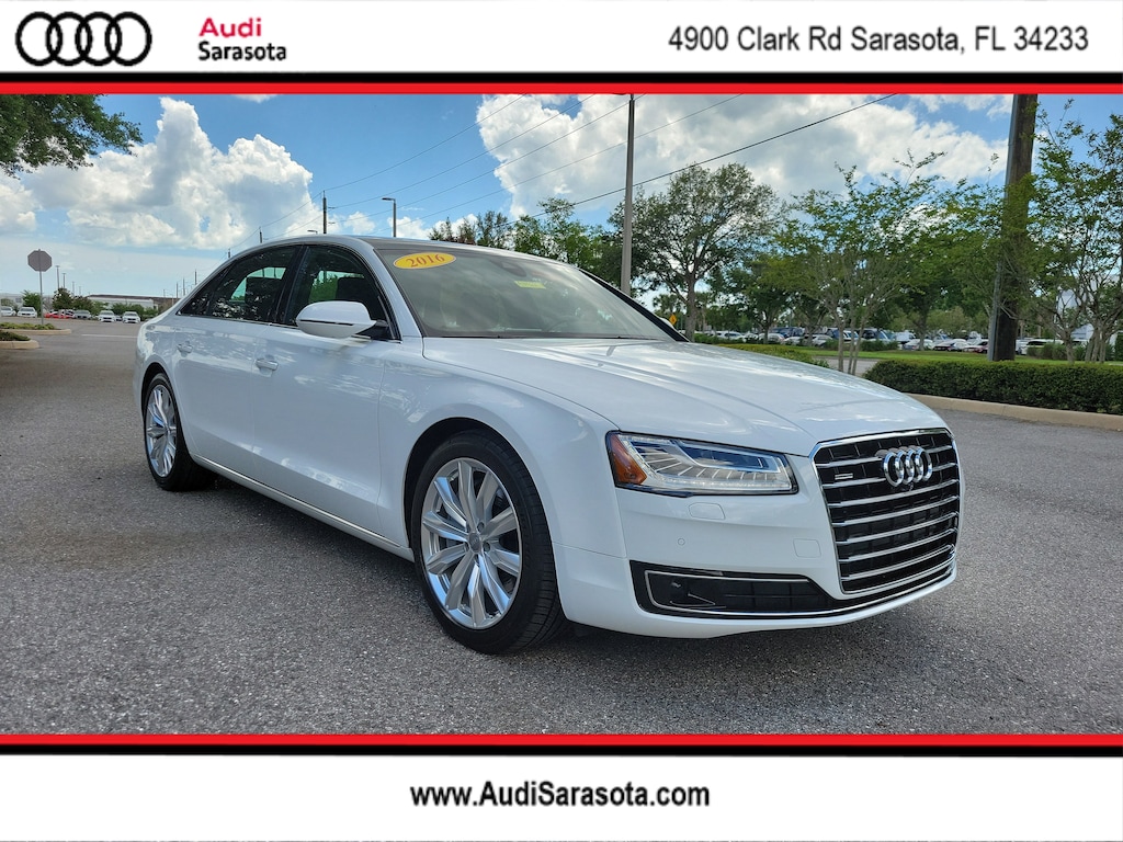 Supercharged, 3.0L 333 HP V-6 with a 8 Speed Auto Transmission..Audi Active Lane Assist..Audi Adaptive Cruise Control with Stop & Go.High-Beam Assistant..MMI Navigation..Panoramic Sunroof..Audi Side Assist Blind Spot Info System..Head Up Display..Backup Camera with Top View System..Audi Pre-Sense Plus..22 Way Adjustable, Heated Leather Seats..20" Alloy Wheels..14 Speaker, 635 Watt Bose Surround Sound System with Satellite Radio and iPod Interface..4-Zone Climate Control..Adaptive Air Suspension..Power Close Doors..Power Rear and Rear Side Window Sunshades..Bluetooth for Phone and Audio..Park Assist..Power Trunk..LED Headlights..4-Spoke Multifunction Heated Steering Wheel..Rear Heated Seats..All power equipment and much more...Call Our Sales Team Now at 941-922-0000 for More Info, a Test Drive Appointment or to have a Custom Video Sent to you on this Car. Fast Out of State Shipping Available!..All pre-owned cars regardless of make and model are driven and evaluated by our highly qualified service personnel. We invite you to come see our brand new state of the art dealership and take a test drive with one of our highly trained Audi Brand Specialists. You will be glad you did..What the reviews say..Luxurious and handsome cabin. Powerful base V6. Sharp handling for a flagship sedan. Standard all-wheel drive. For 2016, the Audi A8 will be offered in only the longer-wheelbase L version on all trim levels. Standard all-wheel drive, along with a carefully tuned suspension, contributes much to this Audi's road manners. Regardless of the wheels and tires you select, this very large sedan grips the road extremely well, and you might be inspired to take back-road detours for the sheer enjoyment of it. Even if you stick to major highways, you'll still be impressed by the way the 2016 Audi A8 carries itself, as the ride is neatly composed and never harsh. Beyond performance, the 2016 Audi A8 is notable for its stunning interior. Powering the 2016 A8 3.0T is a supercharged 3.0-liter V6 engine that produces 333 horsepower and 325 pound-feet of torque. As with all A8 models, the 3.0T uses an eight-speed automatic transmission that drives all four wheels through an all-wheel-drive system. In Edmunds testing, this model reached 60 mph in a short 5.3 seconds, which is quicker than other six-cylinder-powered rivals and almost as quick as some V8s. Standard all-wheel drive provides high levels of cornering prowess and surefootedness on slick roads. Furthermore, the well-tuned suspension and intuitive steering response allow the big sedan to go around tight turns like a much smaller car. Drivers with high expectations for performance and handling should be quite happy with the Audi A8. What's more, the A8 still delivers the superb ride comfort expected of an elite luxury sedan. The big Audi's suspension smooths out the roughest of pavement, and the cabin remains as quiet as a crypt over a variety of surfaces and at highway speeds. This desirable combination of world-class comfort and athletic handling sets the 2016 Audi A8 apart in this class. Among large luxury flagships, interiors are arguably one of the most important deciding factors. The 2015 Audi A8 rises to the occasion with excellent materials, smart design and an abundance of high-tech features. Most Audis are notable for their businesslike austere design, but the A8 is decidedly luxurious in its execution, and rich wood inlays and supple leather surfaces are in abundance. Rear passengers enjoy a wealth of space and amenities.